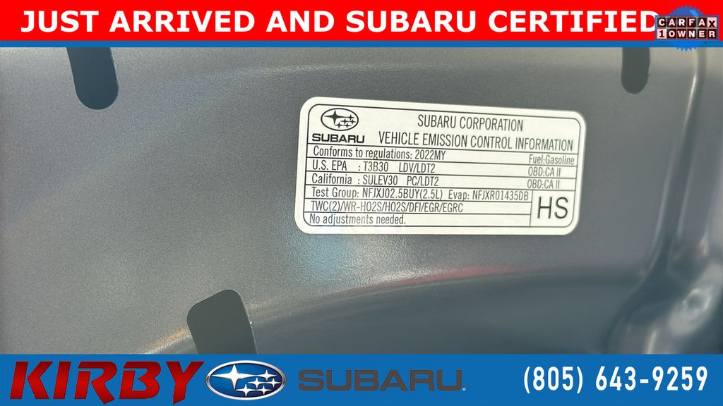 CERTIFIED PREOWNED PROGRAM. Certified. Fresh Oil Change. Fresh Engine Air Filter. Multi Point Safety and Mechanical Inspection Performed by Certified Technician. Certified by Carfax - One Owner. Plenty of Power and Fuel Efficient. Outback Limited. 4D Sport Utility. 2.5L 4-Cylinder DOHC 16V. AWD. Black Leather. All-Weather Floor Liners. Auto-Dimming Exterior Mirror w/Approach Light. Dome Light LED Upgrade. DriverFocus (Driver Monitoring System). Heated Steering Wheel. Popular Package #2. Power Moonroof. Power Moonroof & HSW & Navigation System. Radio: Subaru STARLINK 11.6' Multimedia Nav System. Rear Bumper Cover. Rear Seat Back Protector. Splash Guards. Magnetite Gray Metallic AWD 2.5L 4-Cylinder DOHC 16V 2022 Subaru Outback Limited 26/33 City/Highway MPG